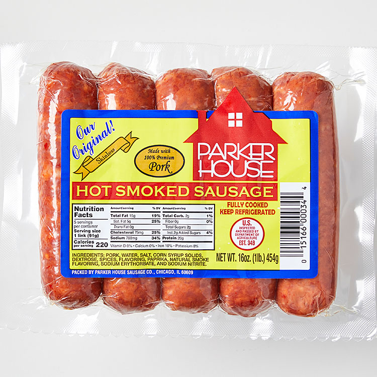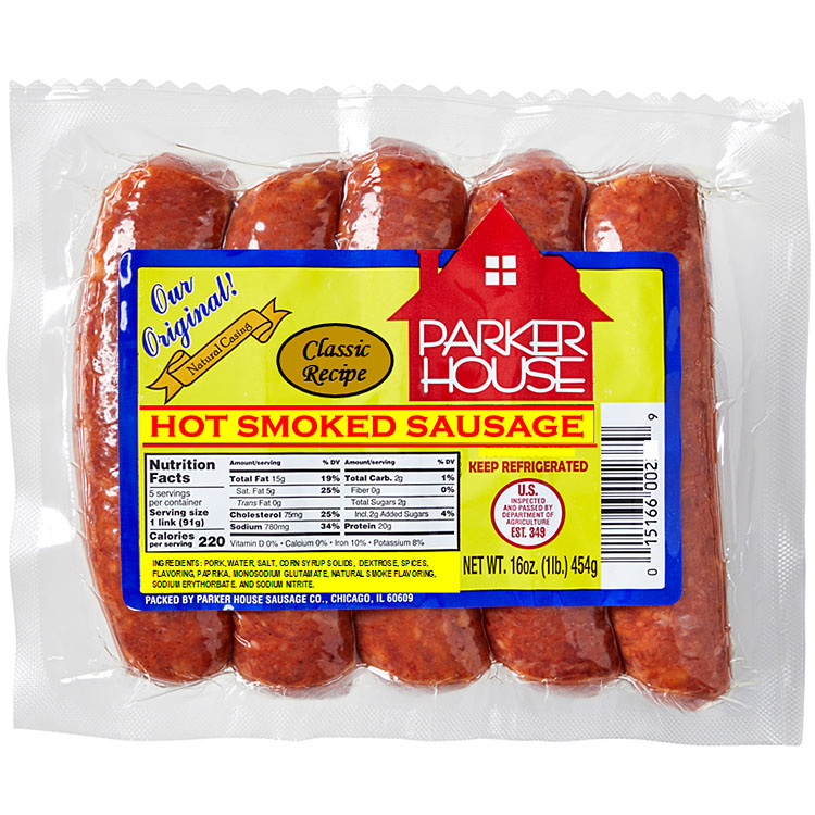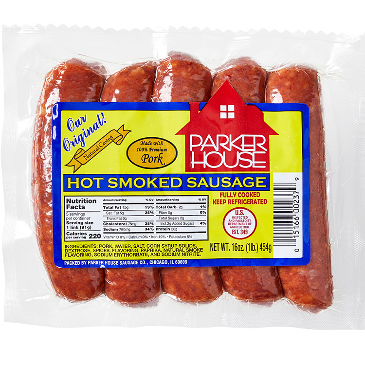 “Famous” Hot Smoked Sausage. You’ll receive 10 individual 1lb vacuum packages of our spicy smoked sausage for a total of 10lbs. Each package contains 5 sausages.
